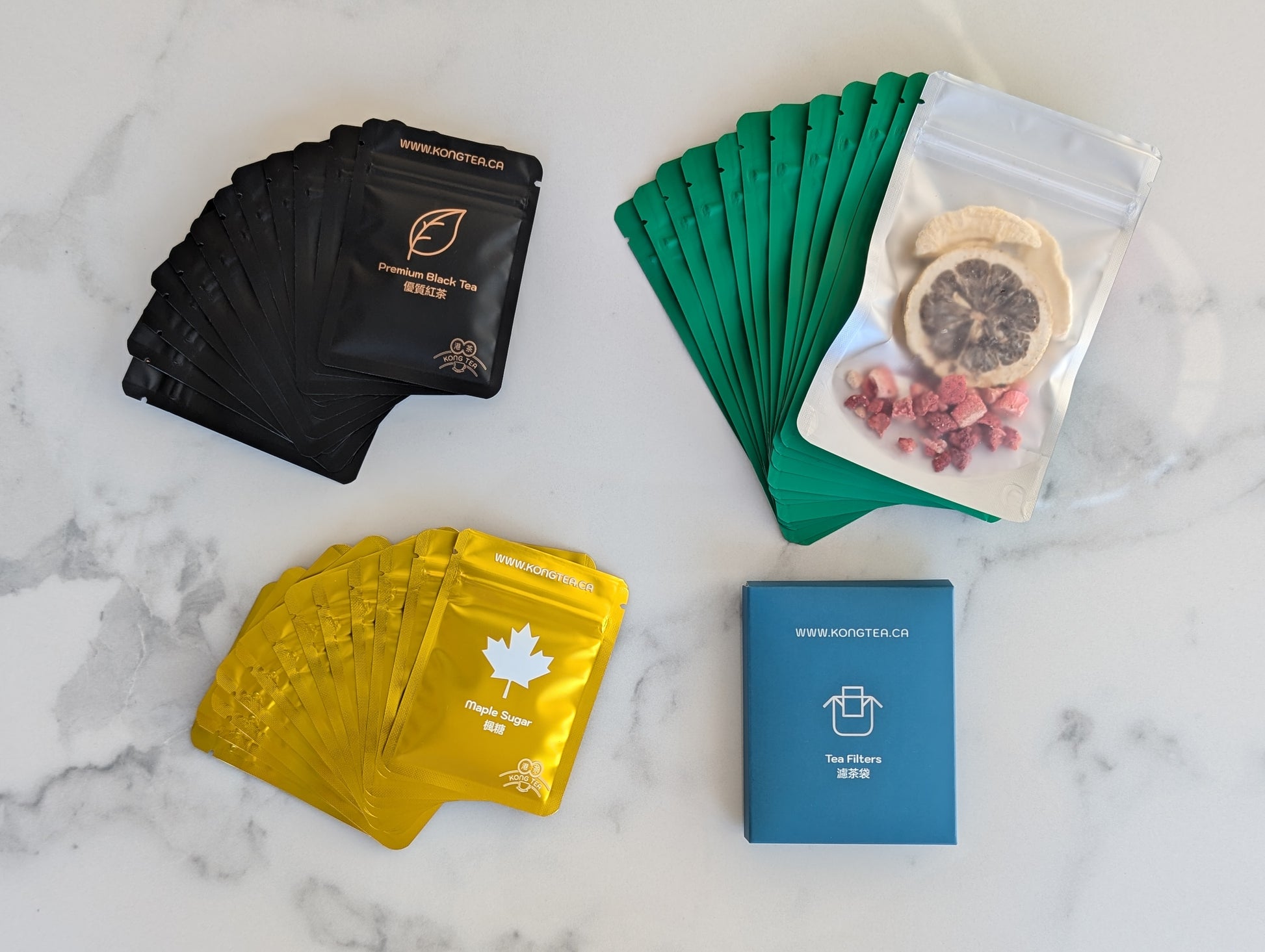 This refill set includes tea, freeze-dried fruits, organic maple sugar, and tea filters. Available in 12, 18 and 24 packs.