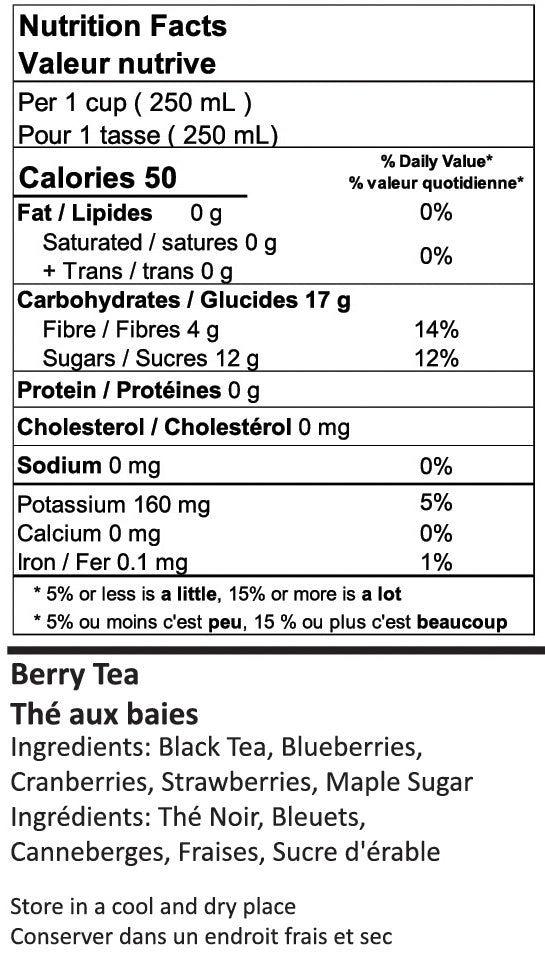 Made of quality cranberries, blueberries and strawberries from British Columbia, this tea is infused with organic maple sugar for a unique and flavorful taste.